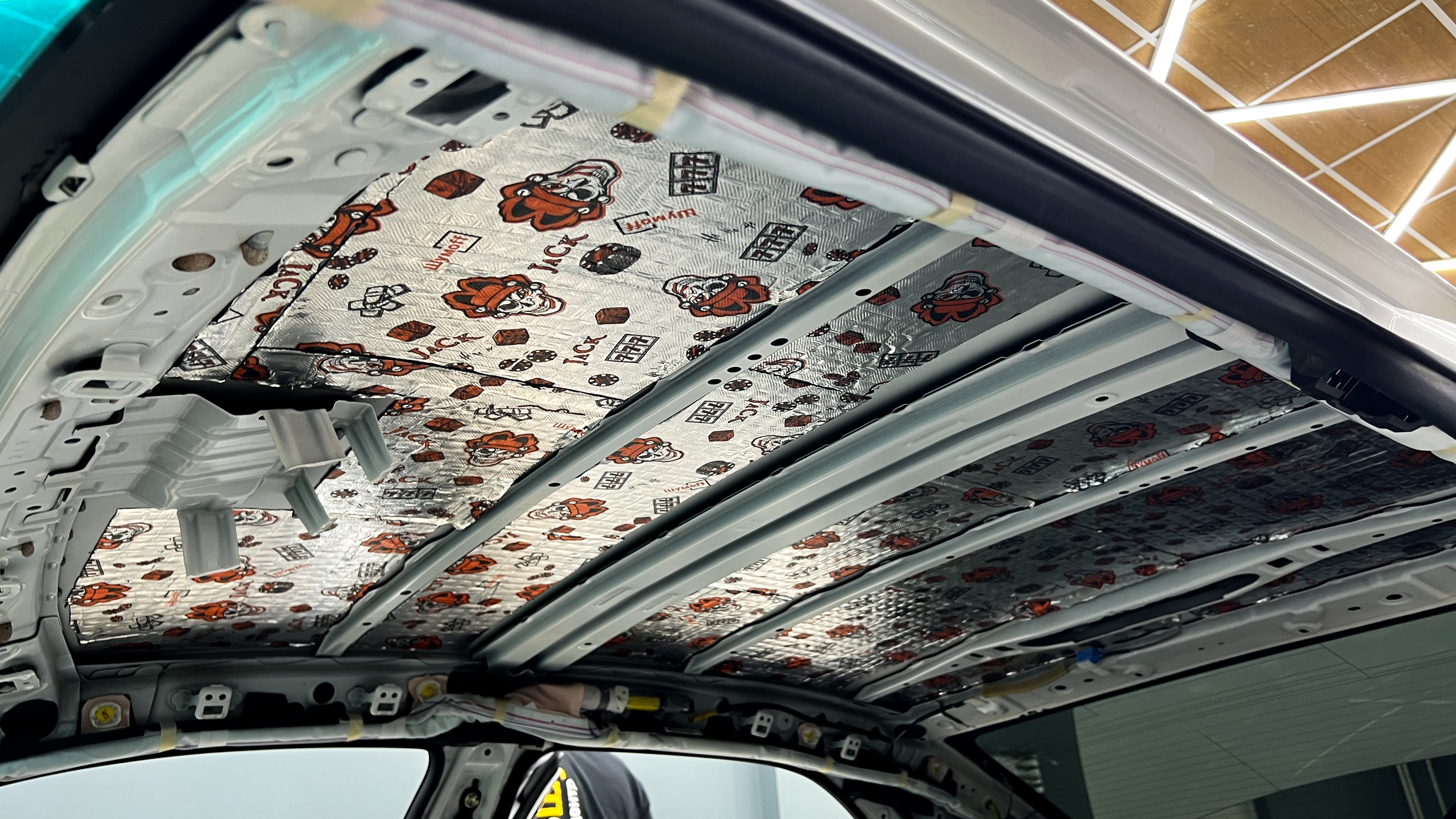 Надеваем новые перчатки и берем чистый инструмент, чтобы не оставить ни единого пятнышка на крыше. Удаляем штатную шумоизоляцию и обезжириваем поверхность.