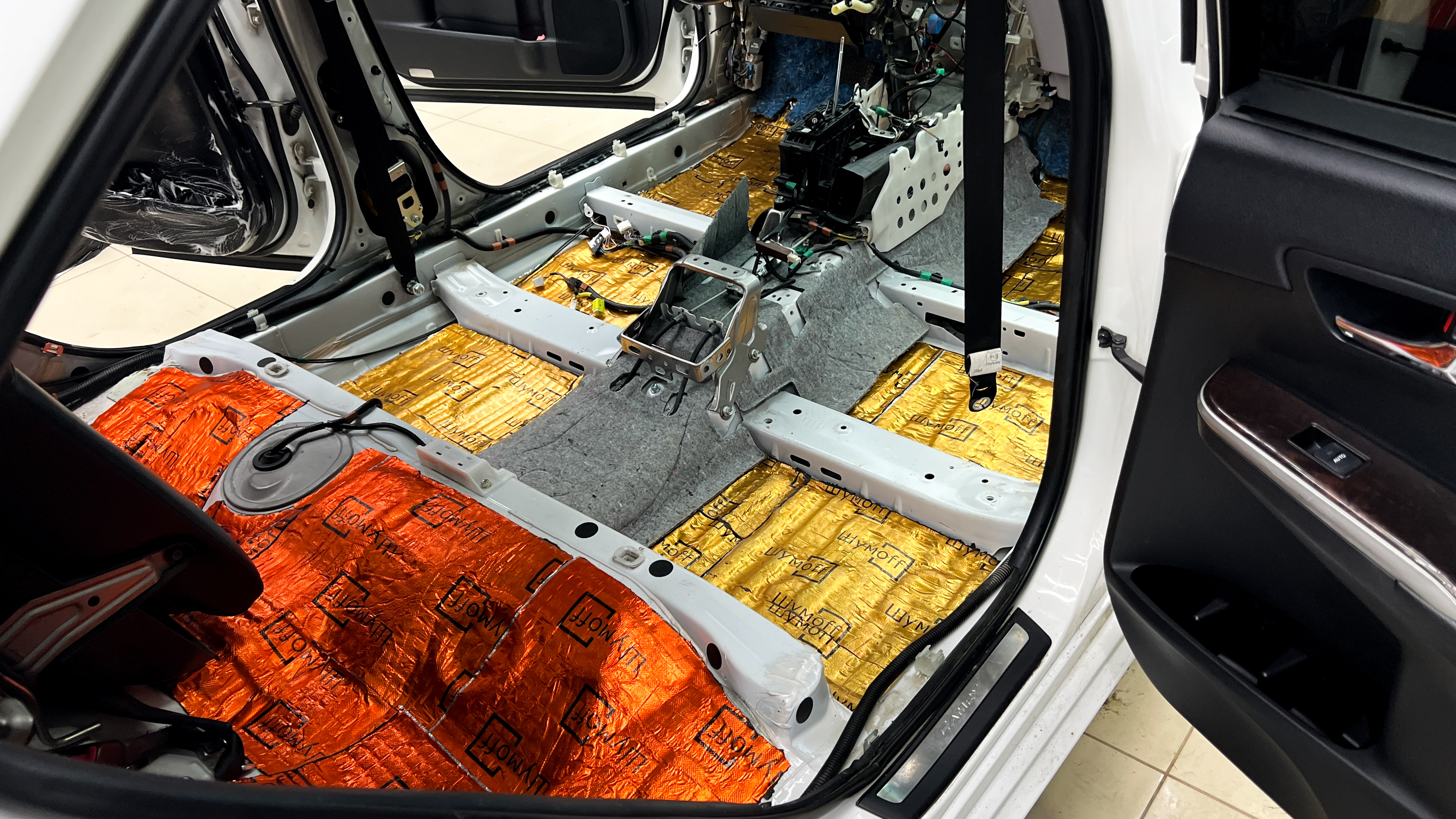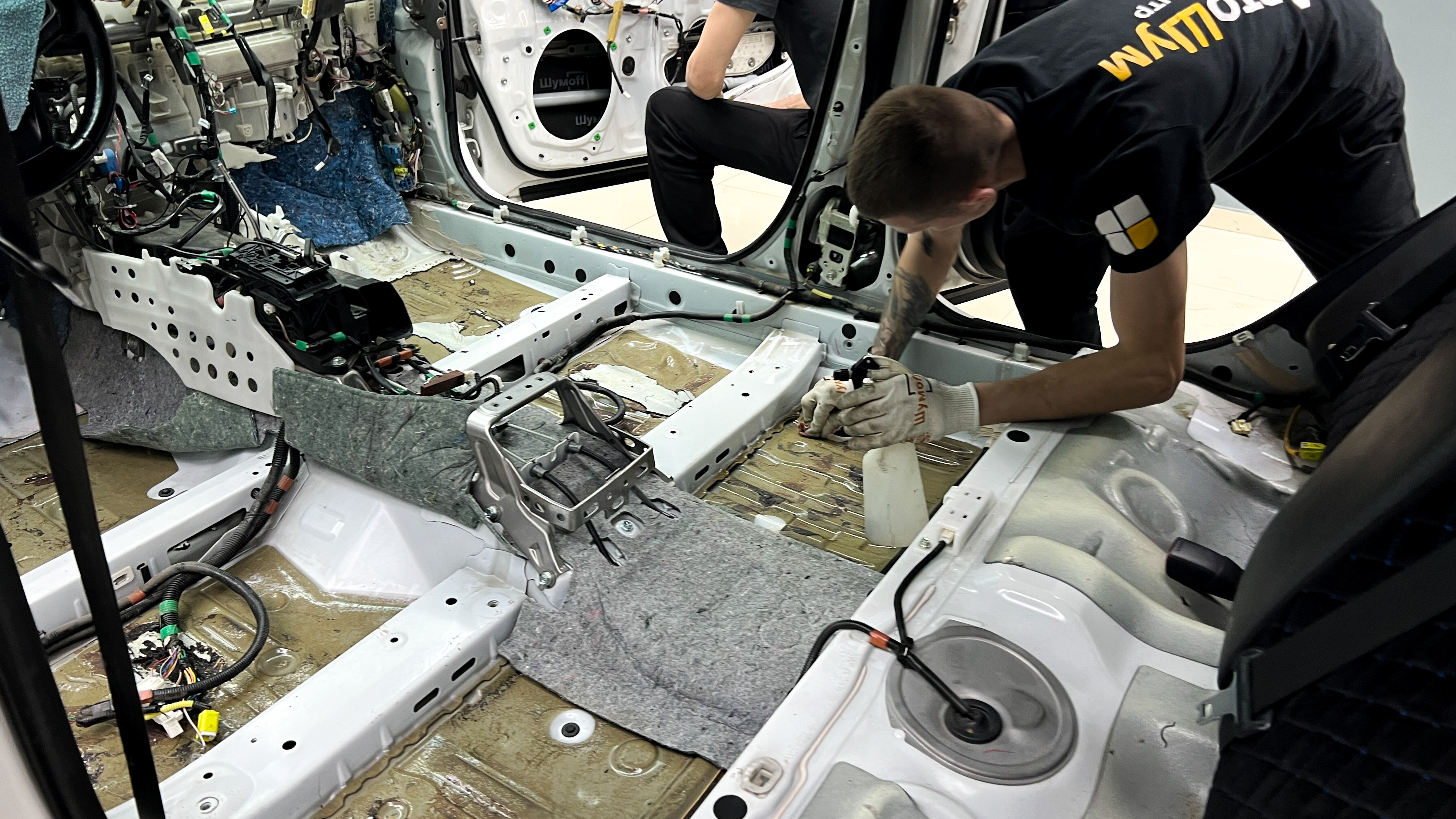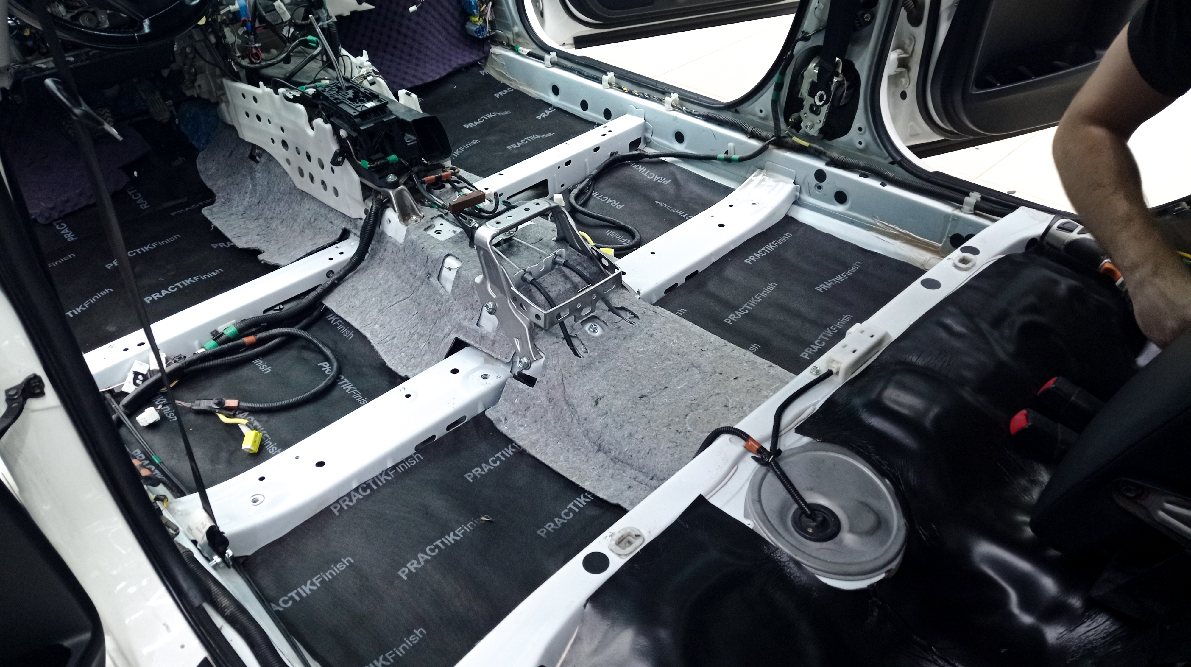 От моторной перегородки и до заднего сиденья вмести с ним клеится мощный многослойный шумо и звукоизолятор Шумофф Prizma 6.