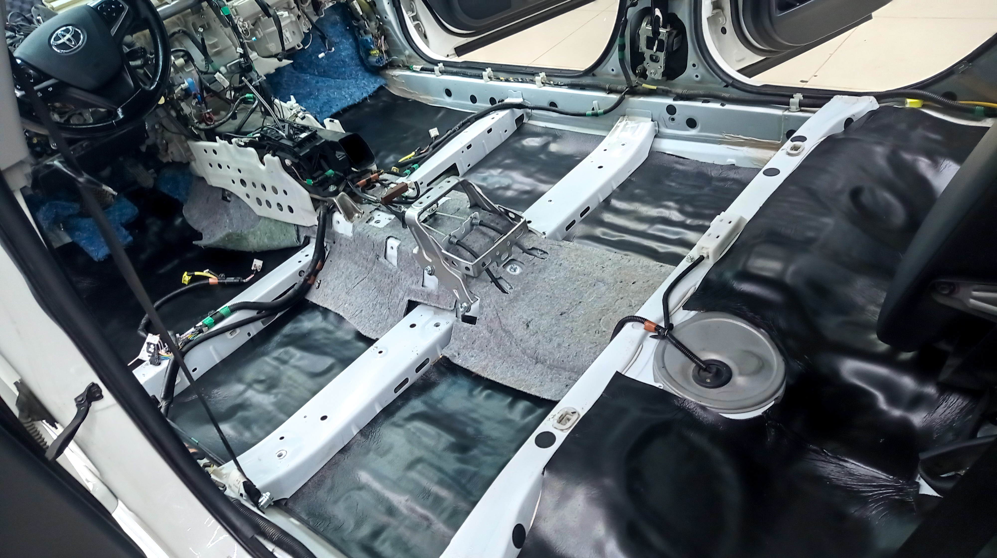 Перед началом шумоизоляции пола на Toyota Camry XV70 (Тойота Камри XV70) необходимо проверить качество адгезии заводской виброизоляции к кузову. Она должна хорошо держаться, в противном, случае её необходимо демонтировать.