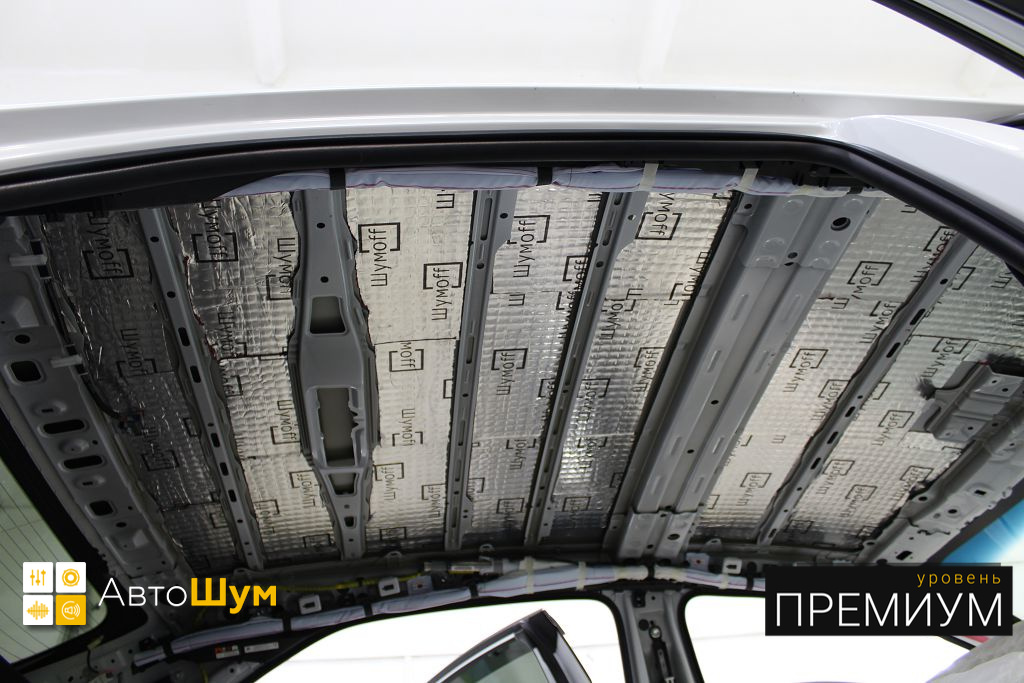 Вторым слоем поверх виброизоляции клеим на крышу современный и очень эффективный шумопоглотитель Шумофф Absorber А15. Так же оклеиваем всю поверхность крыши между ребер жесткости, стыки делаем максимально плотными без щелей. Тем самым получаем на крыше максимально эффективный компоновку из двух видов материалов. Это позволит нам снизить аэродинамический шум, шум от различных природных факторов и значительно увеличить теплоизоляцию в авто.