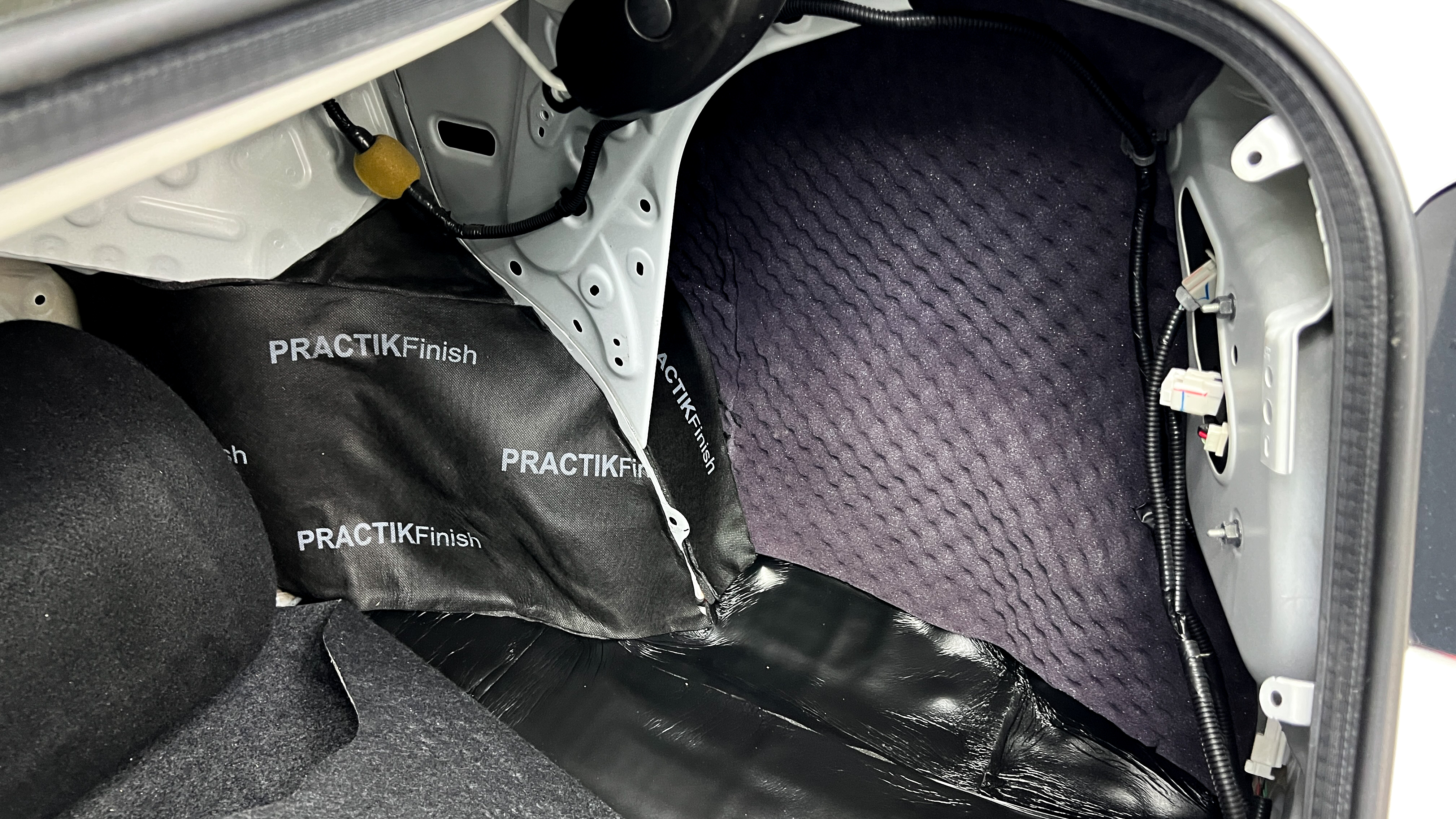 Завершаем шумоизоляцию нанесением третьего слоя звукоизоляционной мембраны Practik Finish на арки. В результате получаем компоновку материалов с максимальной эффективностью и возможностью сборки салона в первозданный вид.