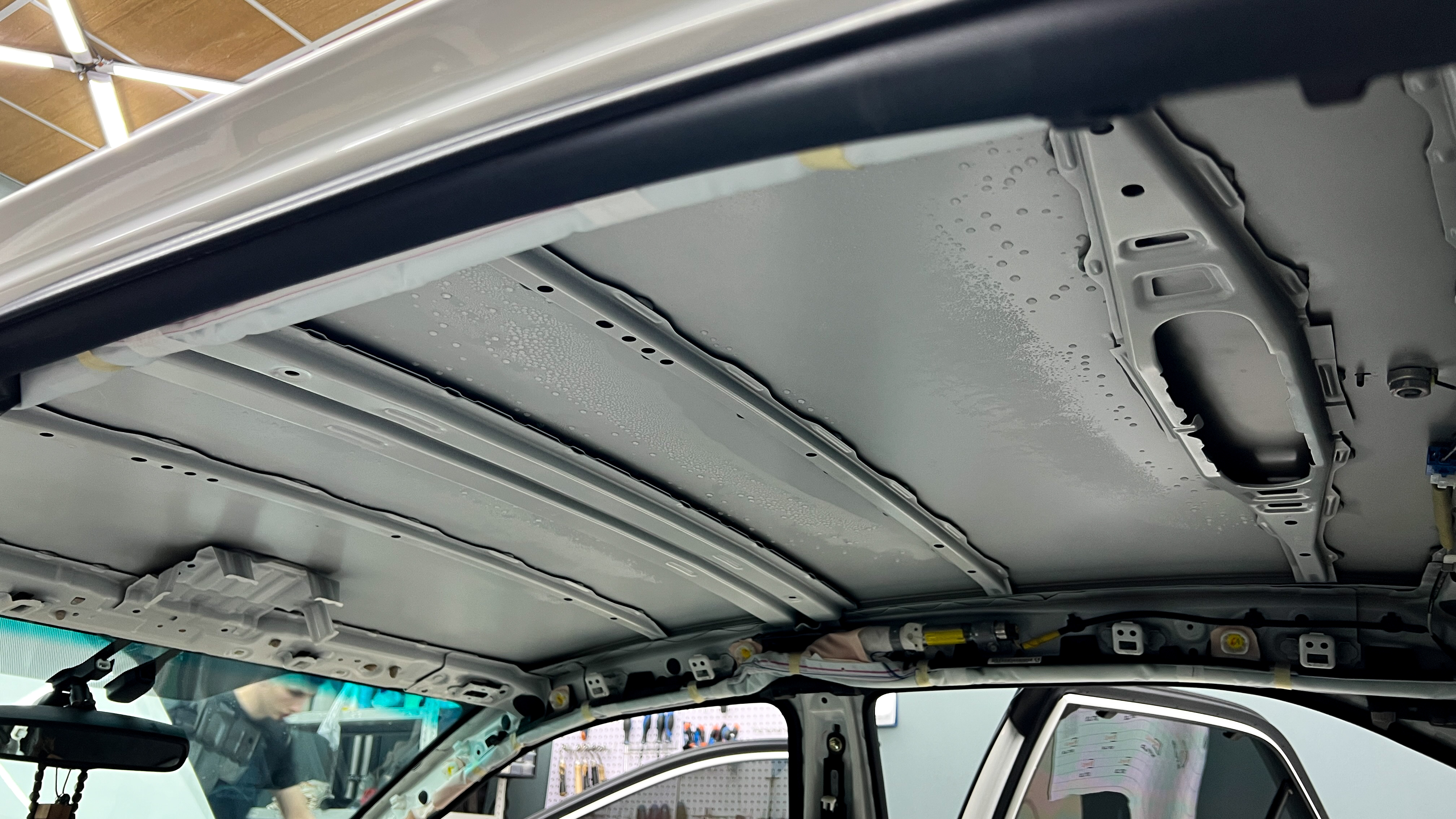 Штатная шумоизоляция крыши на Toyota Camry XV70 (Тойота Камри XV70) полностью отсутствует. Обезжириваем поверхность для начала монтажа виброизоляции.