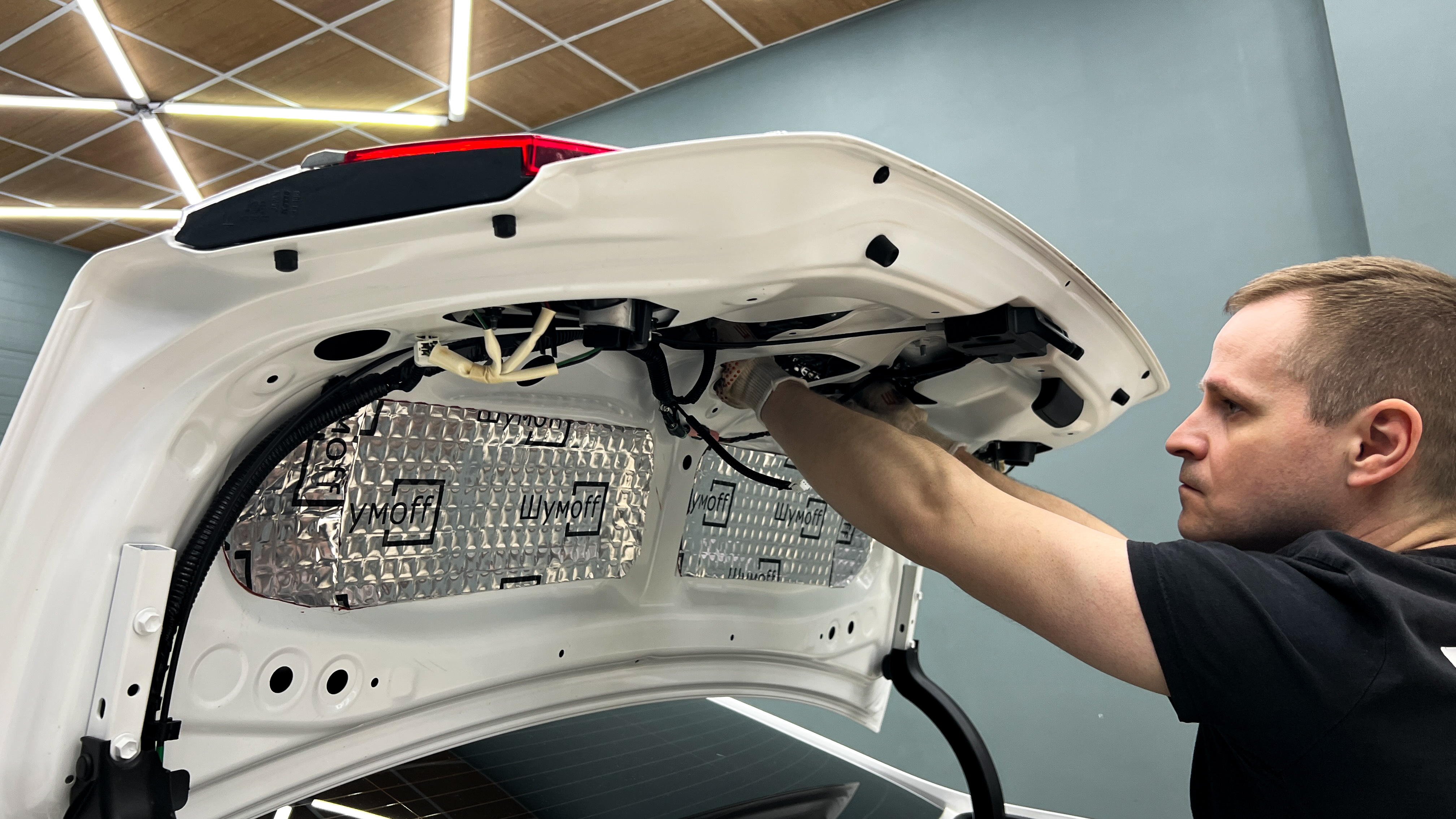 Крышку багажника оклеиваем виброизоляцией Шумофф Joker, это позволит свести увеличение ее веса к минимуму, дабы не возникло проблем с открыванием багажника.