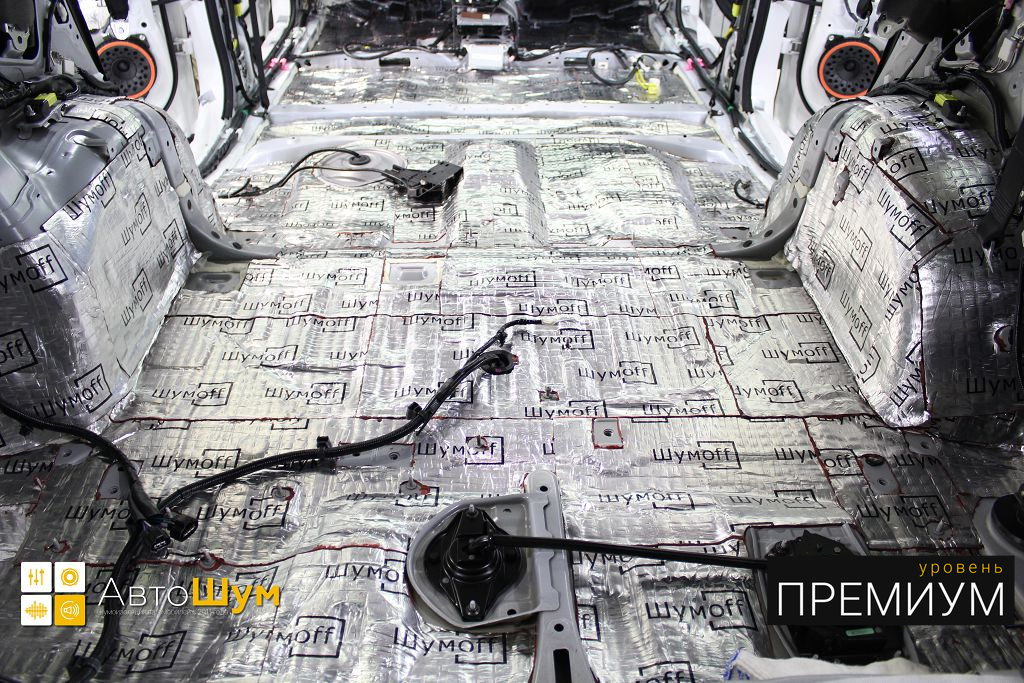 Дно багажника и крылья оклеиваются шумо и теплоизолятором Шумофф П4 4. Арки оклеиваются шумопоглотителем Flex A15.