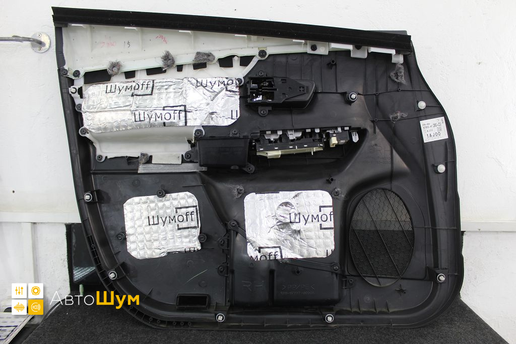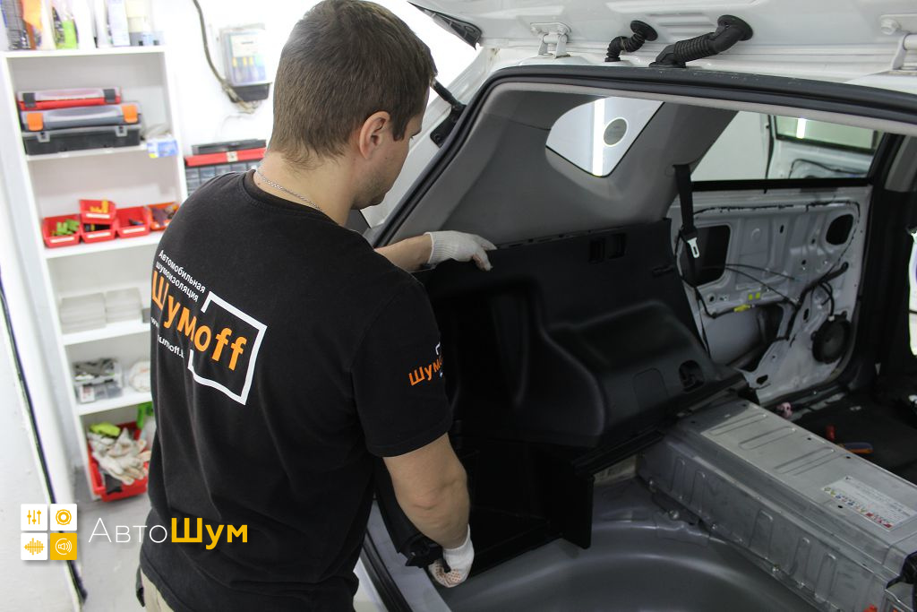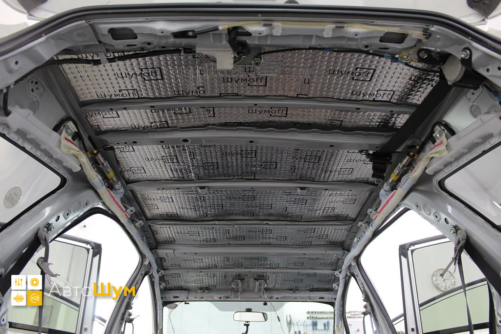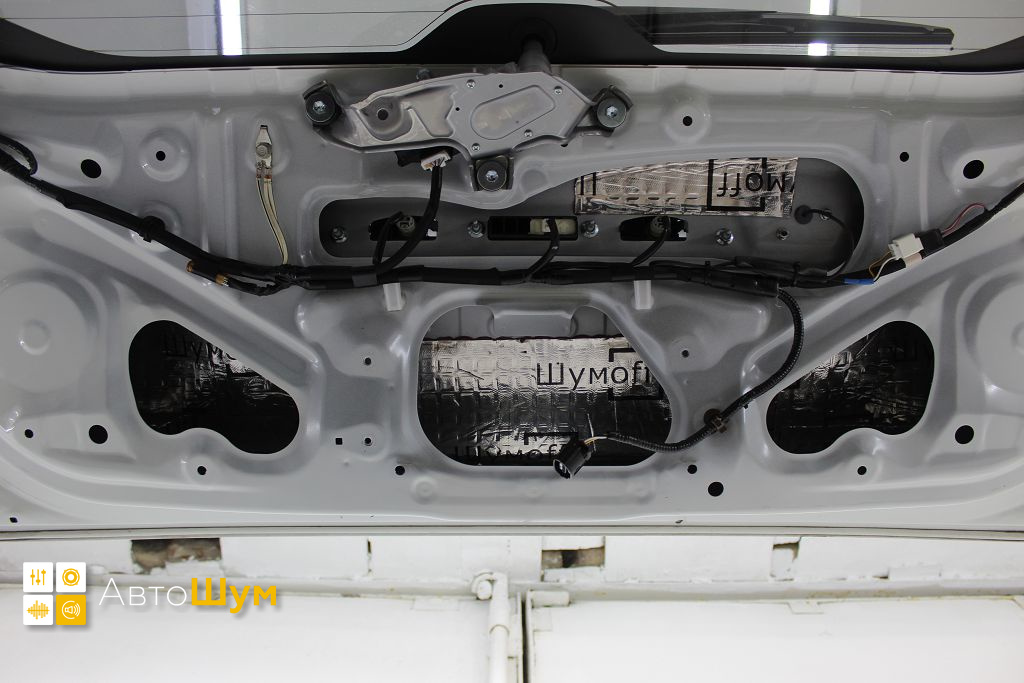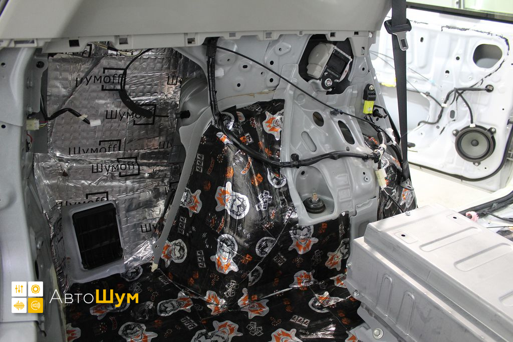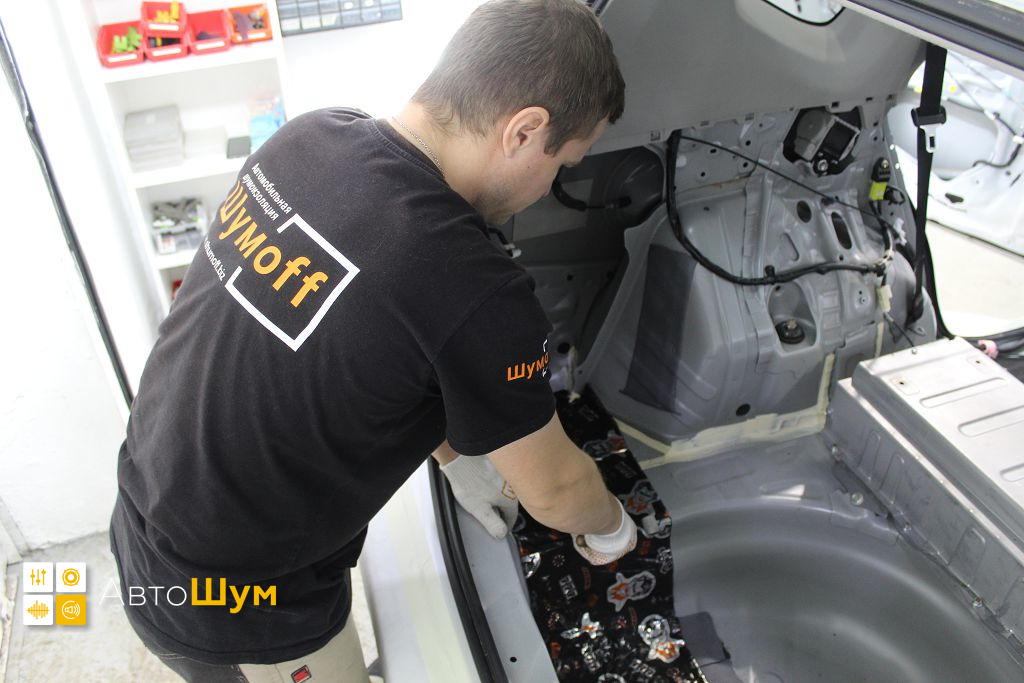 Дно оклеивается многослойным шумо и звукоизолятором Шумофф Prizma 6, крылья, арки и крышка багажника шумопоглотителем Absorber A15.