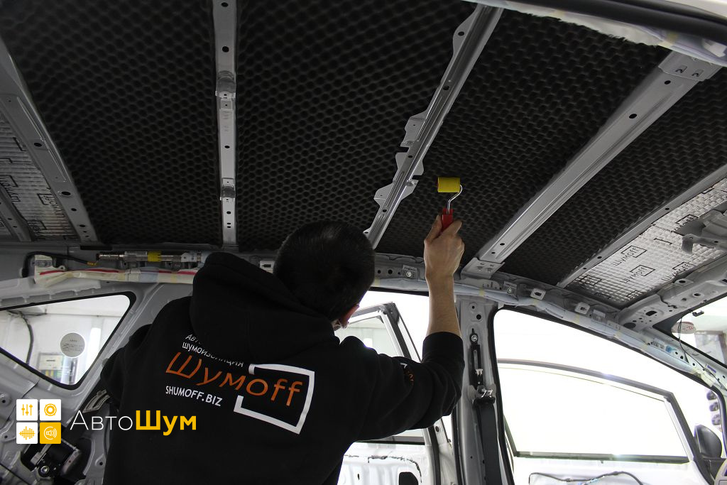 Вторым слоем поверх виброизоляции клеим на крышу современный и очень эффективный шумопоглотитель Шумофф Absorber А15.