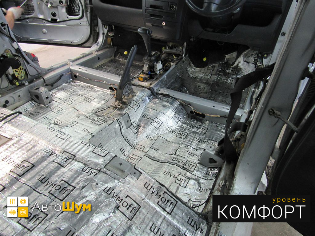 Пол от моторной перегородки и до заднего сиденья оклеивается толстой виброизоляцией Шумофф Super Jack. Под заднее сиденье клеится виброизоляция Шумофф Black Jack.