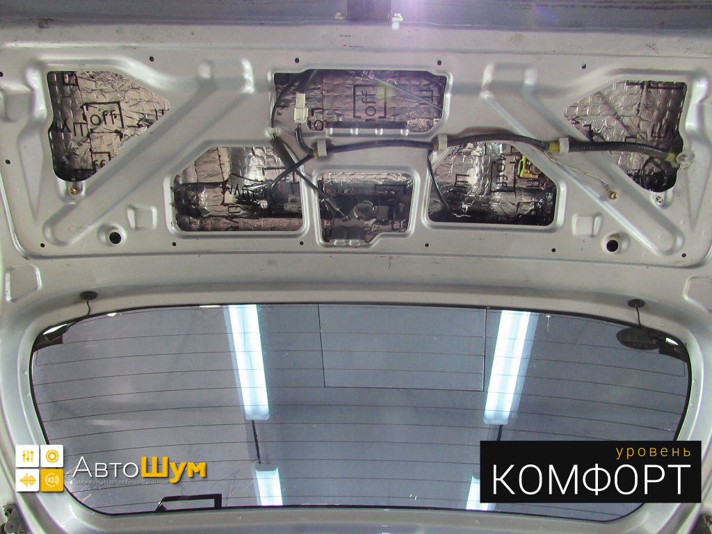 Крышку багажника оклеиваем виброизоляцией Шумофф L2, это позволит свести увеличение ее веса к минимуму, дабы не возникло проблем с открыванием багажника.