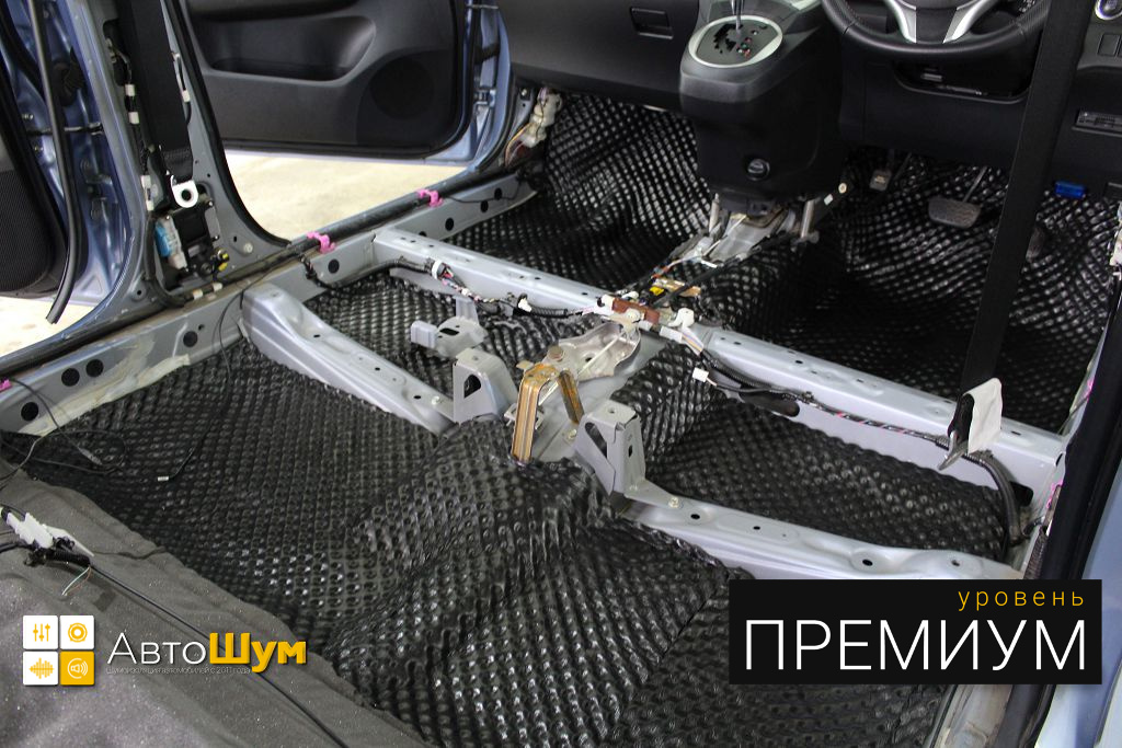 От моторной перегородки и до заднего сиденья вмести с ним клеится мощный многослойный шумо и звукоизолятор Шумофф Prizma 6.