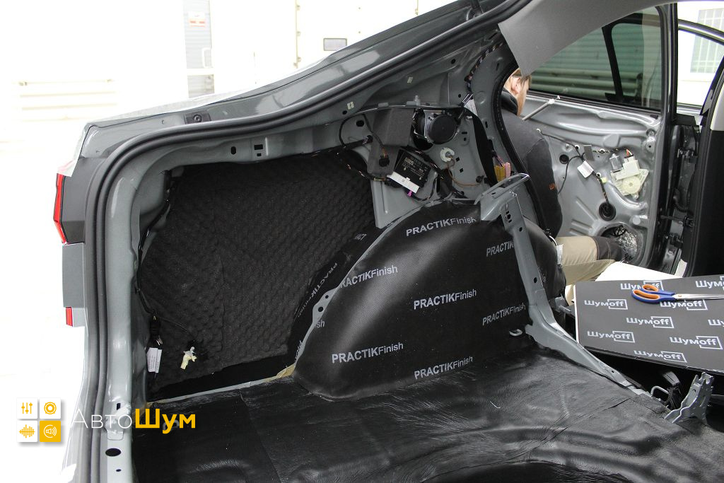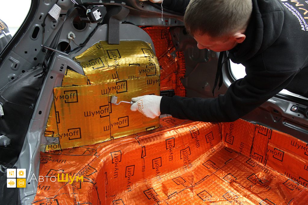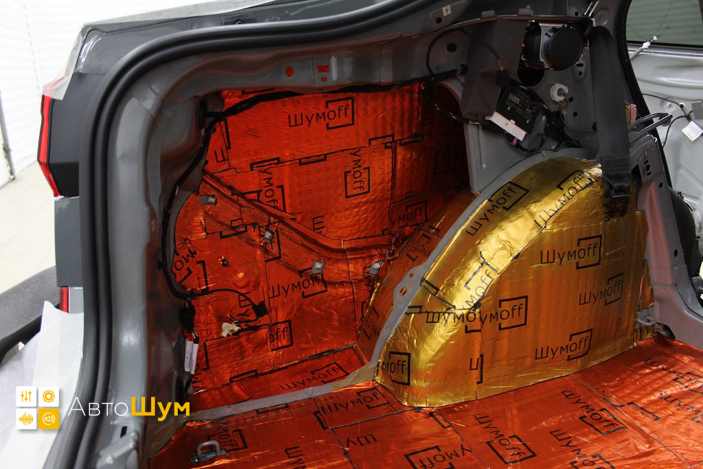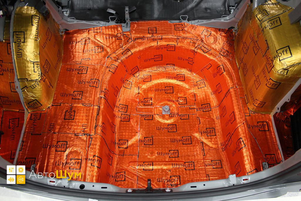 Дно багажника и крылья оклеиваются шумо и теплоизолятором Шумофф П4 4. Арки оклеиваются шумопоглотителем Flex A15.