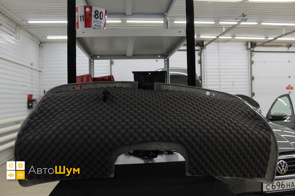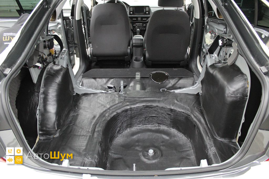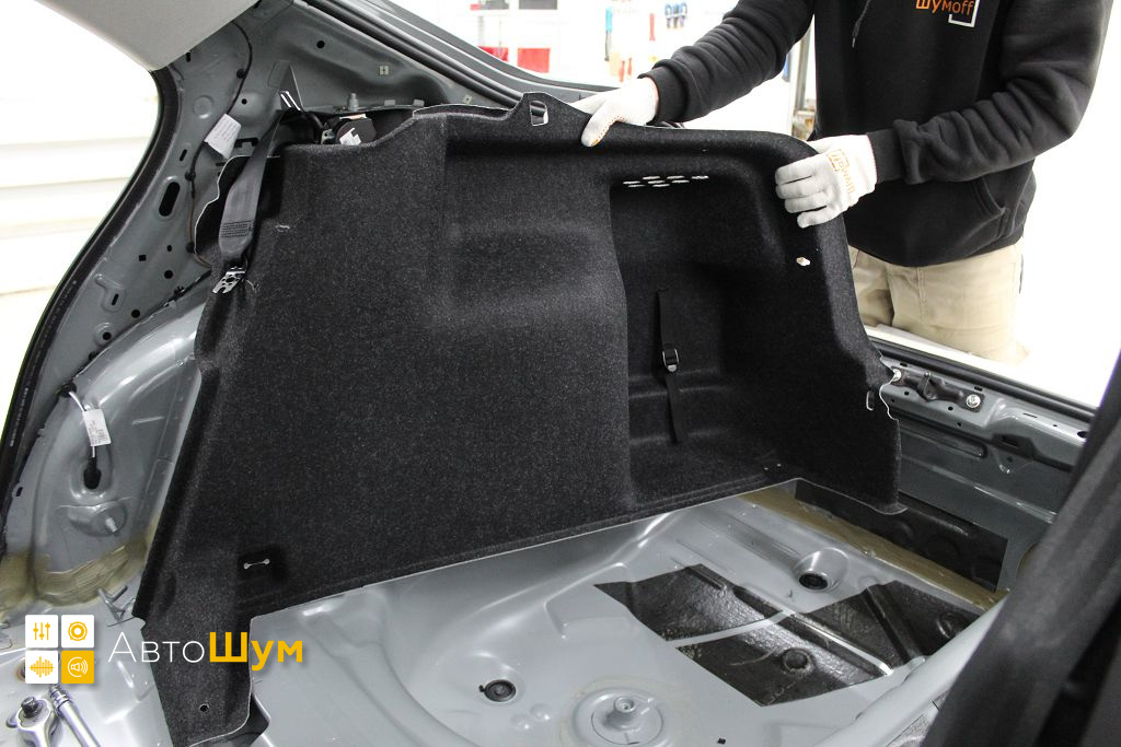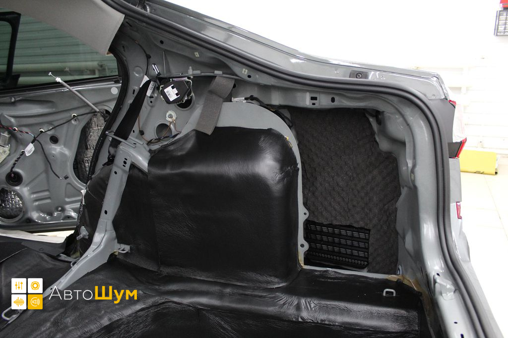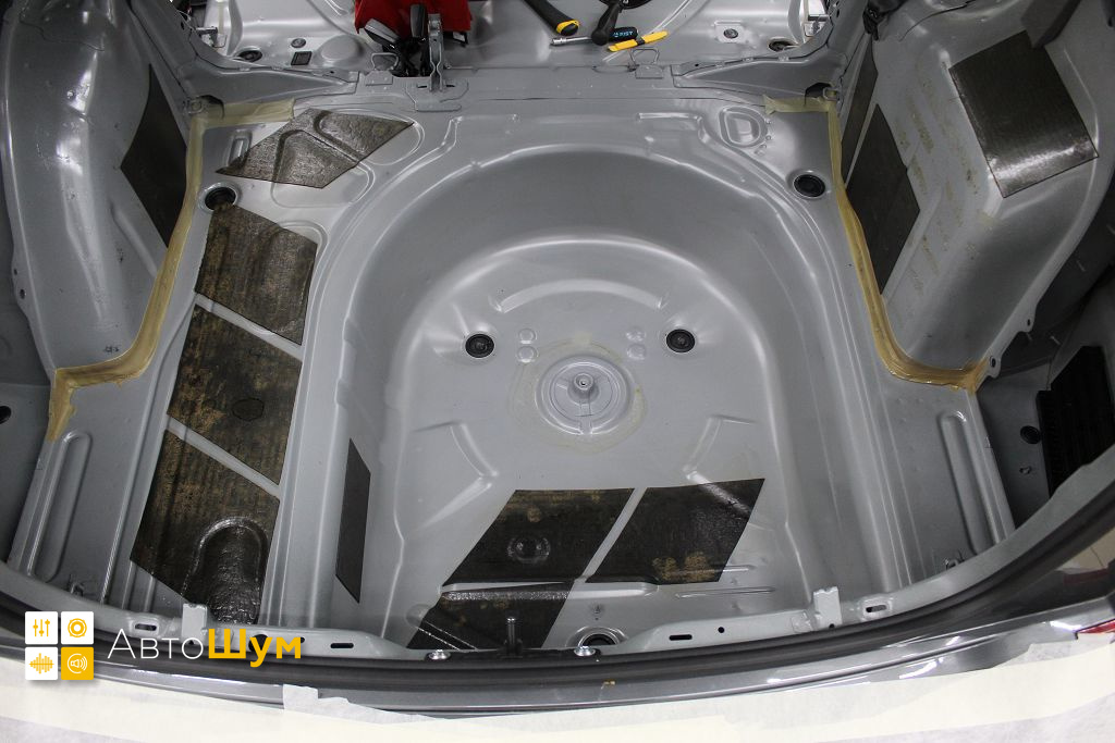 Дно багажника и крылья оклеиваются шумо и теплоизолятором Шумофф П4 4. Арки оклеиваются шумопоглотителем Flex A15.