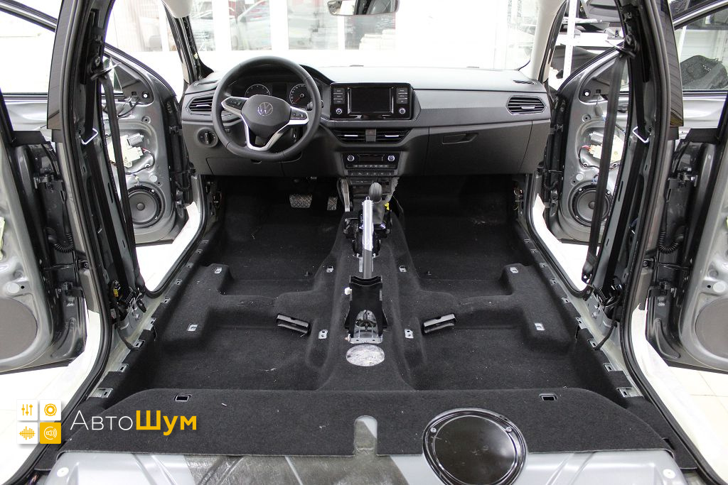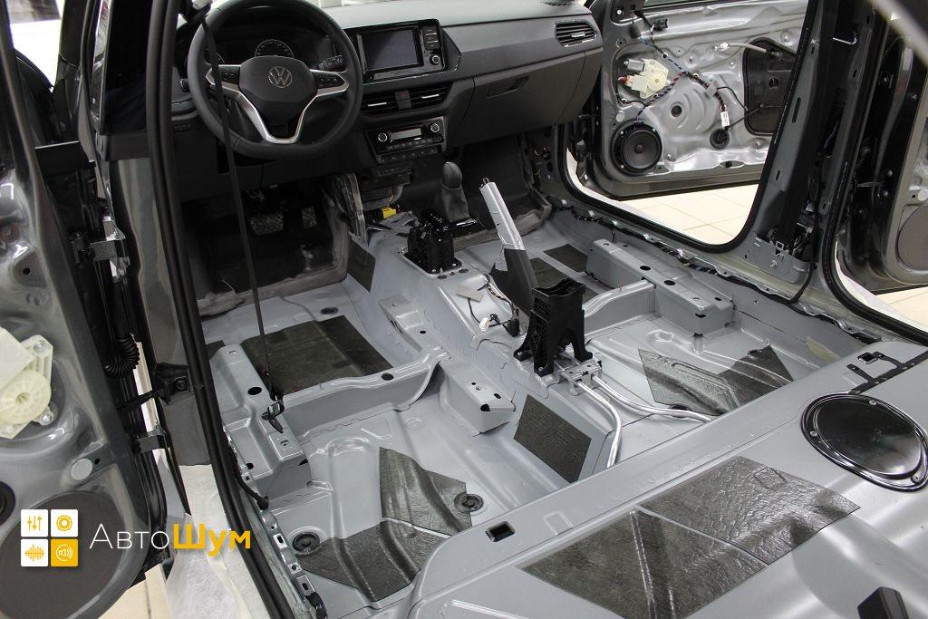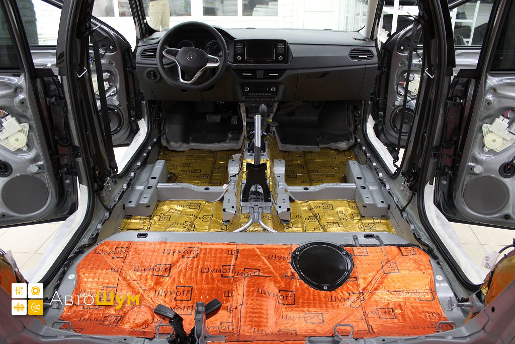 Пол от моторной перегородки и до заднего сиденья оклеивается толстой виброизоляцией Шумофф Super Jack. Под заднее сиденье клеится виброизоляция Шумофф Black Jack.