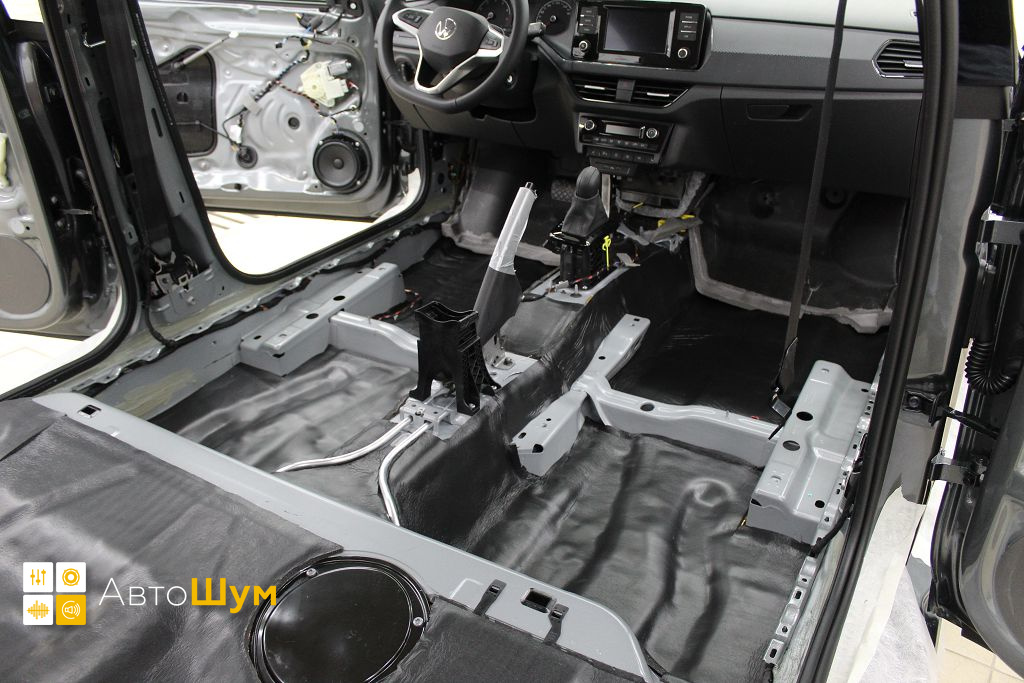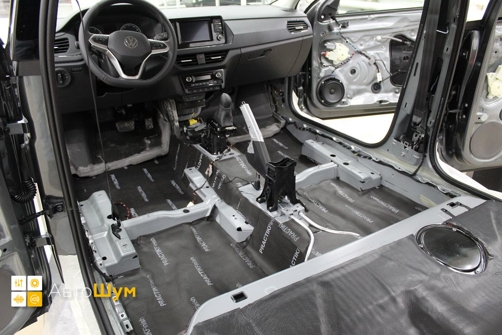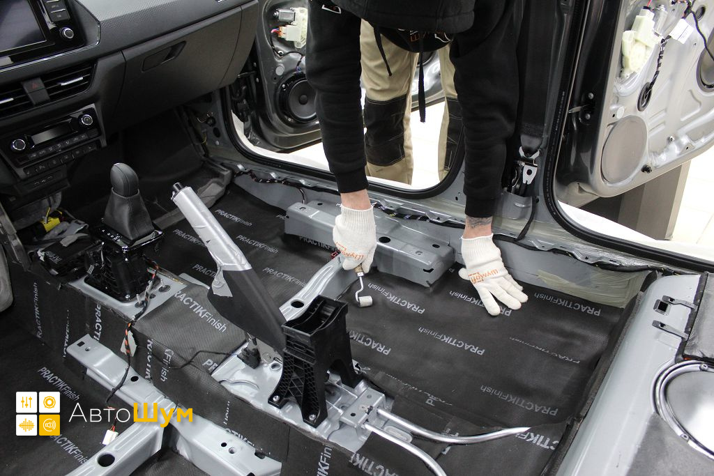От моторной перегородки и до заднего сиденья вмести с ним клеится мощный многослойный шумо и звукоизолятор Шумофф Prizma 6.