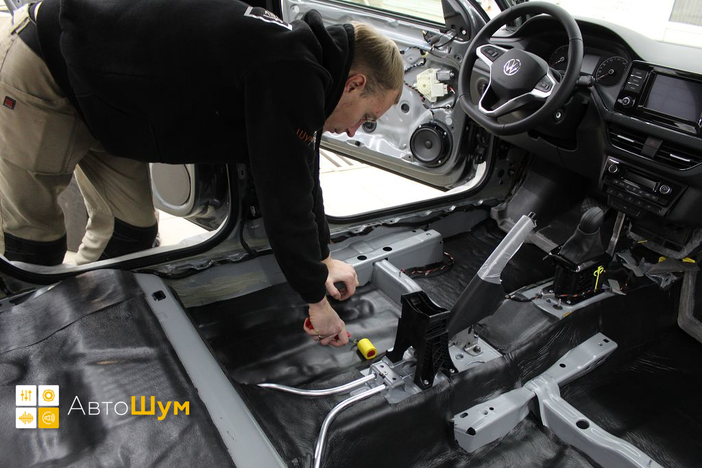 Перед началом шумоизоляции пола на Volkswagen Polo Mk6 (Фольксваген Поло Мк6) необходимо проверить качество адгезии заводской виброизоляции к кузову. Она должна хорошо держаться, в противном, случае её необходимо демонтировать.