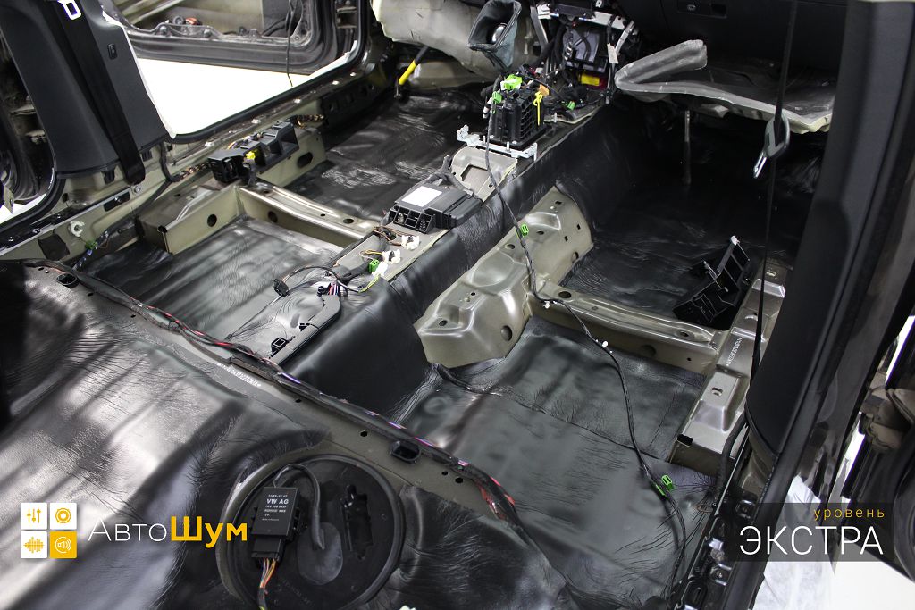 От моторной перегородки и до заднего сиденья вмести с ним клеится мощный многослойный шумо и звукоизолятор Шумофф Prizma 6.