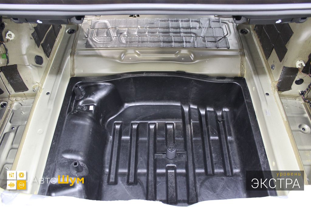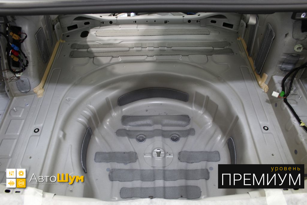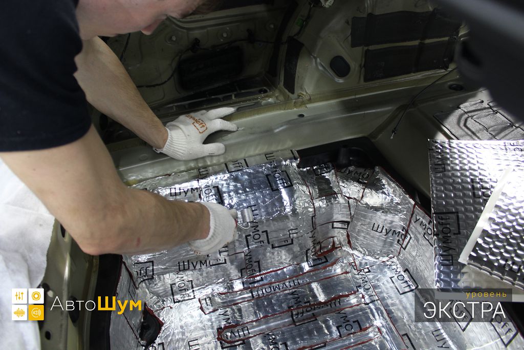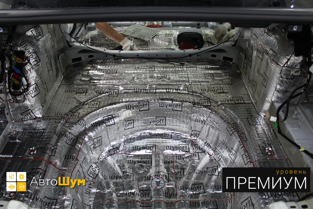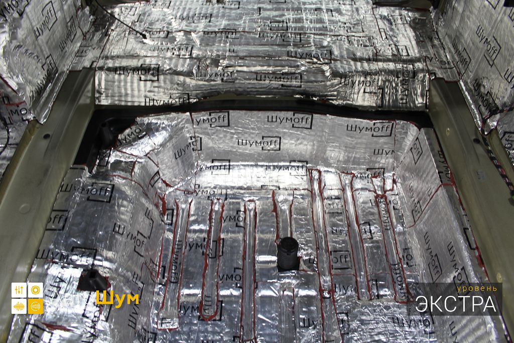 Дно багажника и крылья оклеиваются шумо и теплоизолятором Шумофф П4 4. Арки оклеиваются шумопоглотителем Flex A15.