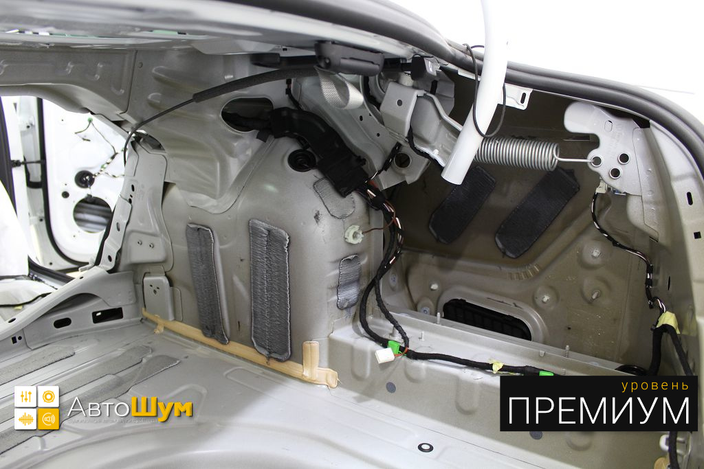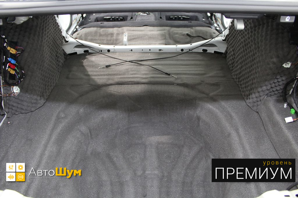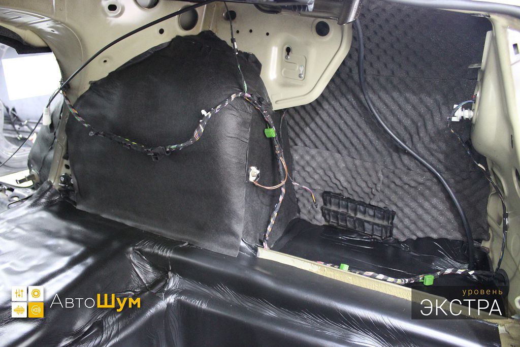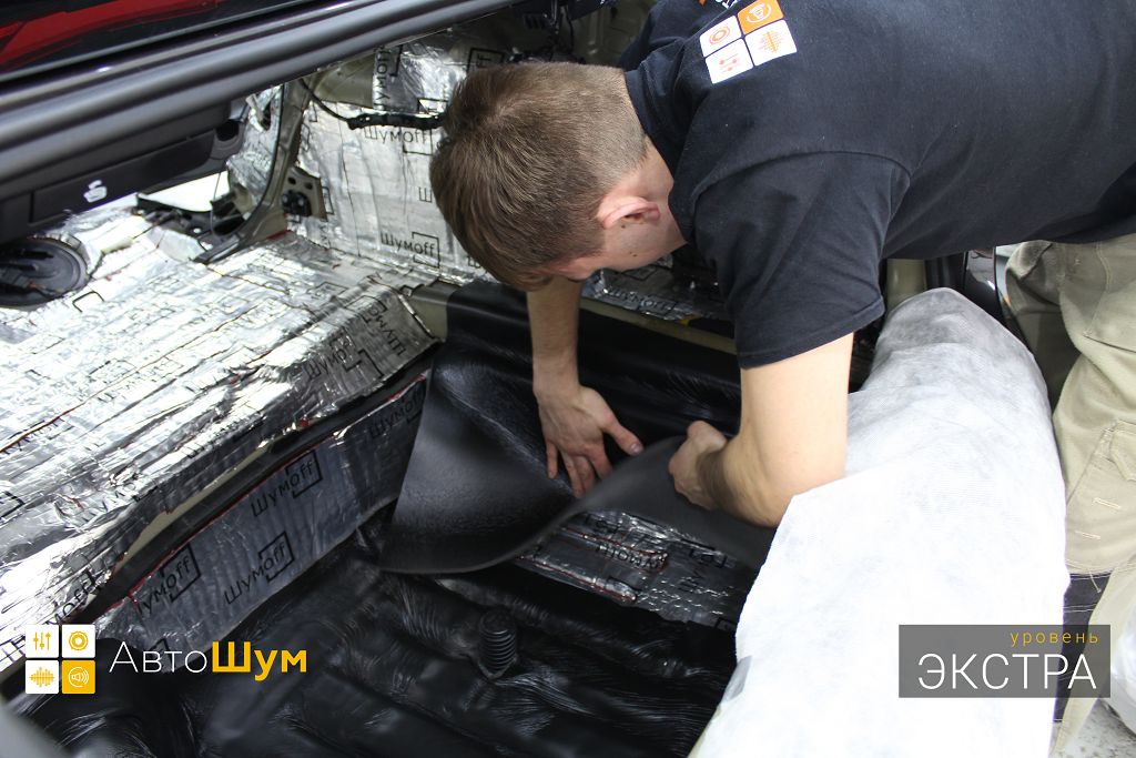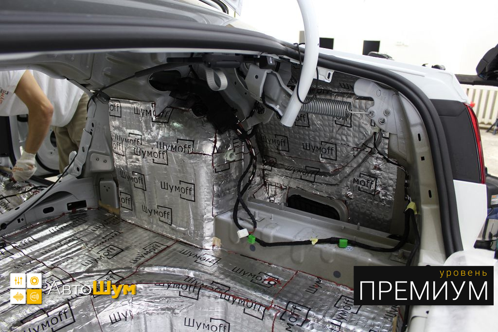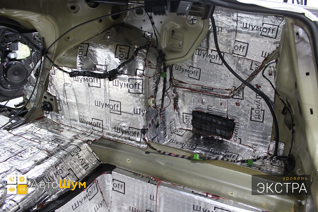 Дно багажника и крылья оклеиваются шумо и теплоизолятором Шумофф П4 4. Арки оклеиваются шумопоглотителем Flex A15.
